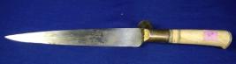| Description / विवरण | Iron knife chhuri having straight single edged blade and ivory hilt that has six incised circles designed on it. The lower part of the blade has koft work and a flower is incrustated at one side of the blade. |