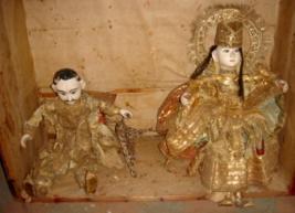 | Description / विवरण | Pair of doll of a Japanese King and queen wearing crown and jari embroidered royal costumes and sitting on pedestals. The crowns are broken, clothes are torn with colours. They are kept in a rectangular glass and wooden case. |