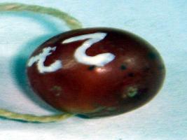 | Description / विवरण | Stone bead cylindrical in shape with natural circular black designs on it and a perforation to pass the thread. |