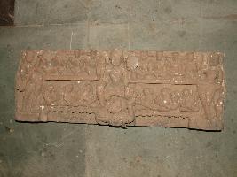 | Description / विवरण | A part of an architecture, this panel has a four armed Vishnu, sitted in Lalitasana on his vehicle Garuda. At the left and right corner, veena player musician lady and an attendant respectively is carved out. Two arms of small miniature figures are carved out having top one with boare shaped head while at the lower panel female celestial figure. |