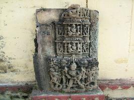 | Description / विवरण | This is a part of a door jamb, which is decorated with Vishnu sculpture. Foru armed god is flanked by female attendants while in top two niches, small figures are carved out. |