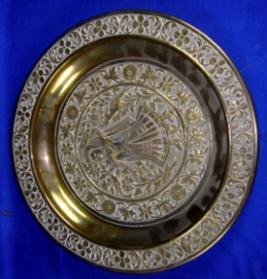 | Description / विवरण | Brass plate having embossed floral work in the inner part with the depiction of a female in dancing position and two birds. |