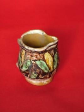 | Description / विवरण | Cream jug, green, yellow and brown pottery. |