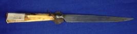 | Description / विवरण | Knife having straight single edged iron blade and ivory hilt which is partly broken at one side and has stains and cracks. |