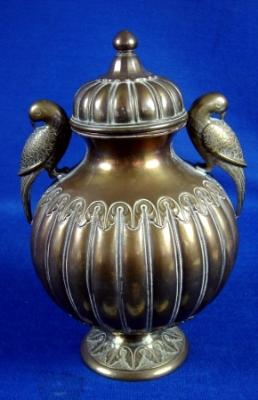 | Description / विवरण | Brass pot having dome shaped lid with knob , round body and carinated footed base. There are two parrot shape handles on each side. It is decorated with embossed leaf design on the body and base. The number 1001 is incised at the neck. |