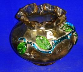 | Description / विवरण | Glass pot having frilled rim and applique floral design. |