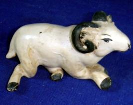 | Description / विवरण | Ram made of paper mache in seated position with two horns. The features are depicted with black paints. |