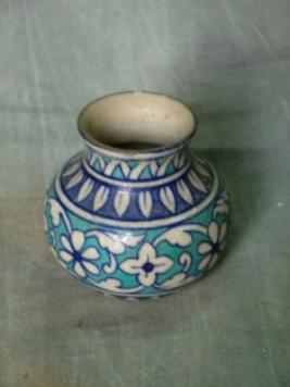 | Description / विवरण | Water vessel, small, floral patterns on the bowl, blue and white pottery. |