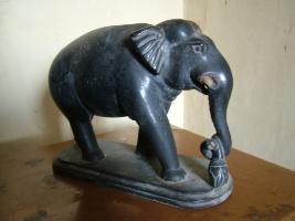 | Description / विवरण | It is a sculpture of an elephant in black marble. It has white teeth holding some object with trunk. |