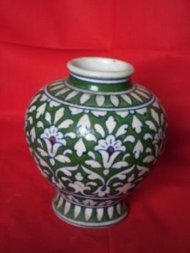 | Description / विवरण | Vase, globular belly, white blue and green coloured, floral patterns on light blue. School of Art, Jaipur. |