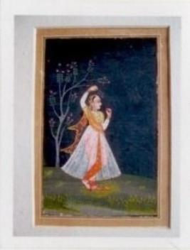 | Description / विवरण | A woman is standing by a tree with flowers wearing a transparent white gown with red trouser printed by golden flowers yellow blows and a lot of jewellery in the foreground. The river is painted with grey water and green rusher. In background black sky is shown border is painted in golden colour in rectangular manner |