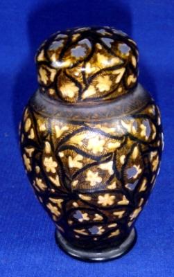 | Description / विवरण | Small wooden perfume container with lid. It has flat circular base and bulbous but tapering body. It has koft work of floral designs all over the body. |