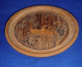 | Description / विवरण | Small wooden plate circular in shape designed with carving of ducks and plants inside. |