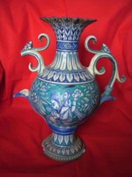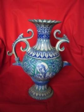 | Description / विवरण | Vase with two handles, Amber shape. White, blue and green. Two mythological Gods on the bowl. |