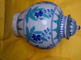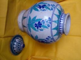 | Description / विवरण | Preserve jar, white, dark blue and turquoise blue. It has flower designs. |