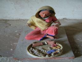 | Description / विवरण | It is a lady model, selling flower, it has covered herself above waist by yellow fitchu. Bangle in her hand also exist. |