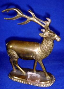 | Description / विवरण | Small brass statue of a standing stag on an oval platform. |