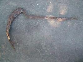 | Description / विवरण | It is a iron sickle, having long handle, is found in very corroded position. |