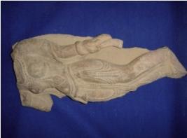 | Description / विवरण | This is a figure of an attendant in standing posture. Her two breasts have been shown with ornamentation, but now broken. Her body is bejeweled. This piece is also having floral designs executed with the help of carving work. |