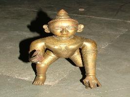 | Description / विवरण | It s a brass sculpture of Bal Mukund. Half standing pose. Engraved design done in neck ornament. Hair style. Ear and arm s triangle shape hair style. Left hand finger damaged. |