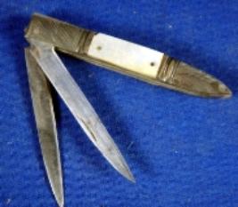 | Description / विवरण | Iron foldable knife having two straight blades fitted in a single handle. The handle is fitted with shell and designed with incised lines. |