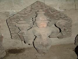| Description / विवरण | It is a broken sculpture of four armed god, Vishnu, the lord of preservation shown holding his attributes, mace and wheel, is heavily ornamented. |