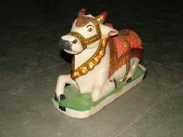 | Description / विवरण | This is a marble sculpture of Nandi Bull . It is multicoloured and golden painted with ornamented decoration with a green painted pedestal. |