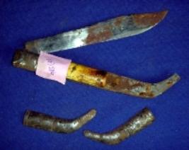 | Description / विवरण | Foldable iron knife with slightly curved blade and ivory fitted handle. The handle is partly broken. |
