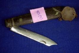 | Description / विवरण | Foldable iron knife with straight blade. A bird is curved on the wooden handle. |
