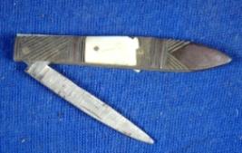 | Description / विवरण | Small foldable iron knife with straight blade. The handle is fitted with shell and designed with incised lines. |