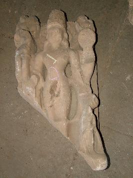 | Description / विवरण | This is an image of Vishnu. Lower portion of it is lost and remaining upper portion in partially broken. He is shown four handed but two hands are badly broken. He is holding chakra and lotus. He is in standing posture. Floral designed halo has been shown behind his head. Three other figures both right and left side of his head is shown. |