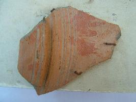 | Description / विवरण | It is a broken piece of a red ware pot, having patch of deep red seen easily over with various lines in parallel way over the neck portion. |