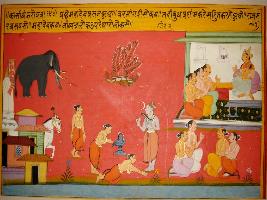 | Description / विवरण | Miniature painting based on Kashi khand depicting Budha standing with crossed legs. He is shown worshipping Shiv in lower middle part. Shiv neck appears and he lies down on ground. To its left four sages are shown sitting and discussing. They are shown talking to a king in court at the extreme right, a part of temple with houses is depicted. |