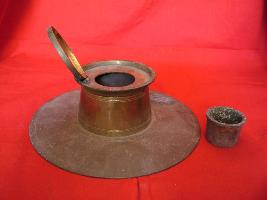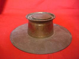 | Description / विवरण | It is an inkpot with flat and circular base and a cylindrical body with a lid, fixed by a clamp. The ink container is fixed by a groove. |