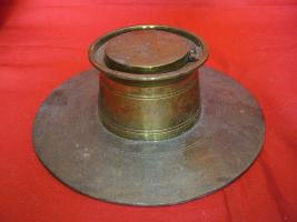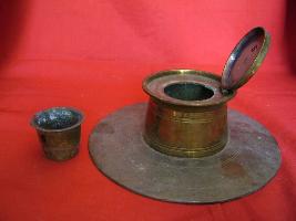 | Description / विवरण | It is an inkpot with flat and circular base and a cylindrical body with a lid, fixed by a clamp. The ink container is fixed by a groove. |