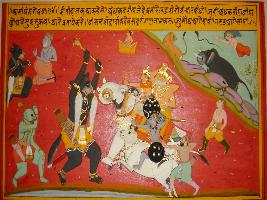 | Description / विवरण | Miniature painting based on Kashi khand depicting fight between Andhakasur and Shiv, Brahma and Indra in the centre of the painting. On the right hand side Guru Shukracharya is giving blessings to demon Andhakasur. |