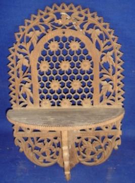 | Description / विवरण | Wooden wall hanging, the upper side is semi circular in shape having jali works and floral designs. A semi-circular platform is fixed in its body which is foldable. |