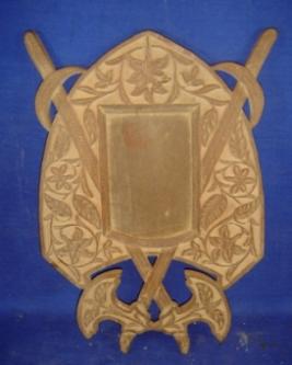 | Description / विवरण | Wall hanging made of wood in the shape of a shield. Two axes are craved on top crossing each other. At the centre space for frame is provided. Flora and fauna is carved on its exterior. |