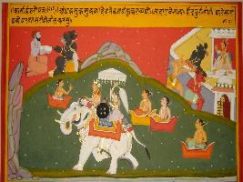 | Description / विवरण | Miniature painting based on Kashi khand depicting Shukracharya telling Andhakasur to capture Swarg, Andhakasur capturing Swarg and compelling Indra to fled to some hill on elephant back. |