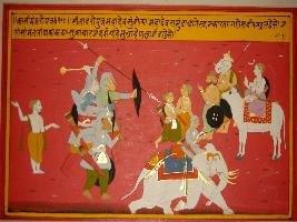 | Description / विवरण | Miniature painting based on Kashi khand depicting Ram and Laxman in the centre. Shiv on Nandi, Ganesh and Brahma are depicted on one side and Shukracharya and demons are depicted on the other side. |