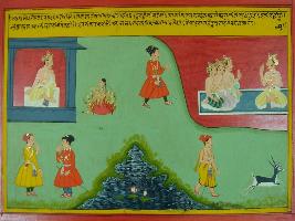 | Description / विवरण | Miniature painting based on Mahabharat - Ashwamegh parva depicting Ram is thinking over the matter to leave Sita or not. He is thinking that as Sita got purified by fire he cannot leave her. His brothers are depicted standing besides him. |