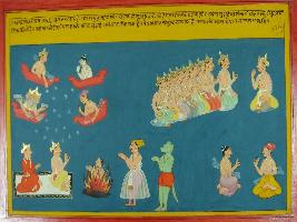 | Description / विवरण | Miniature painting based on Mahabharat - Ashwamegh parva depicting Bharat telling about fire examination and purification of Sita. All gods and demons are watching the event. All his predecessor like king Mandhata and Dashrath got heaven due to their deeds and fame. |