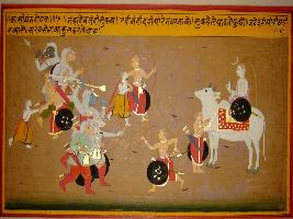 | Description / विवरण | Miniature painting based on Kashi khand depicting Shiv telling one of his men to bring Shukracharya standing on backside of demons army. He goes and brings Shukracharya holding his hand. |