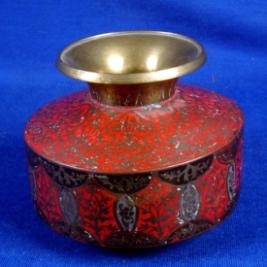 | Description / विवरण | Small water pitcher made of brass. It is decorated with creeper designs of golden, red and black enamelled colours on the body and the base. |