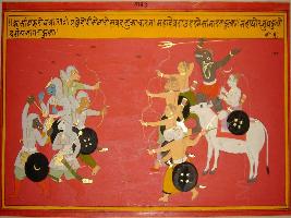 | Description / विवरण | Miniature painting based on Kashi khand depicting war between army of demons and Shiv. In Shiv s army, Ganesh, Shivgana, Brahma, and Kaal are shown. |