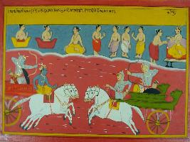 | Description / विवरण | Miniature painting based on Mahabharat - Ashwamegh parva depicting Sudhana attacking with arrows on Arjun and gods are surprised to see that event. |