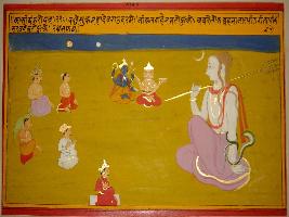 | Description / विवरण | Miniature painting based on Kashi khand depicting Shiv sitting and holding trishul in his right hand and snake in his left hand. At left part other Gods including Brahma, Vishnu, Indra are shown sitting around him with Apsara, human being depicted in lower right. |
