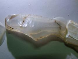 | Description / विवरण | It is a white miniature stone blade with sharp tip in the middle portion, having triangular design carved out, without sharp blade. |