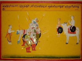 | Description / विवरण | Miniature painting based on Kashi khand depicting Shukracharya Rishi giving Aashirwad to demon king at extreme right to its left, army of demon are shown leaving forward. At the upper left, Shiv shown sitting on Nandi and nearby Shiv gana is shown. |