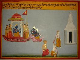 | Description / विवरण | Miniature painting based on Kashi khand depicting Shivsharma visiting his lok in his yaan and telling the story about Shukracharya. Rishi Brihgu is depicted with his son Shukracharya at lower level. Above this Shukracharya is shown leaving for penance and at the extreme left, Shiv temple is depicted. |